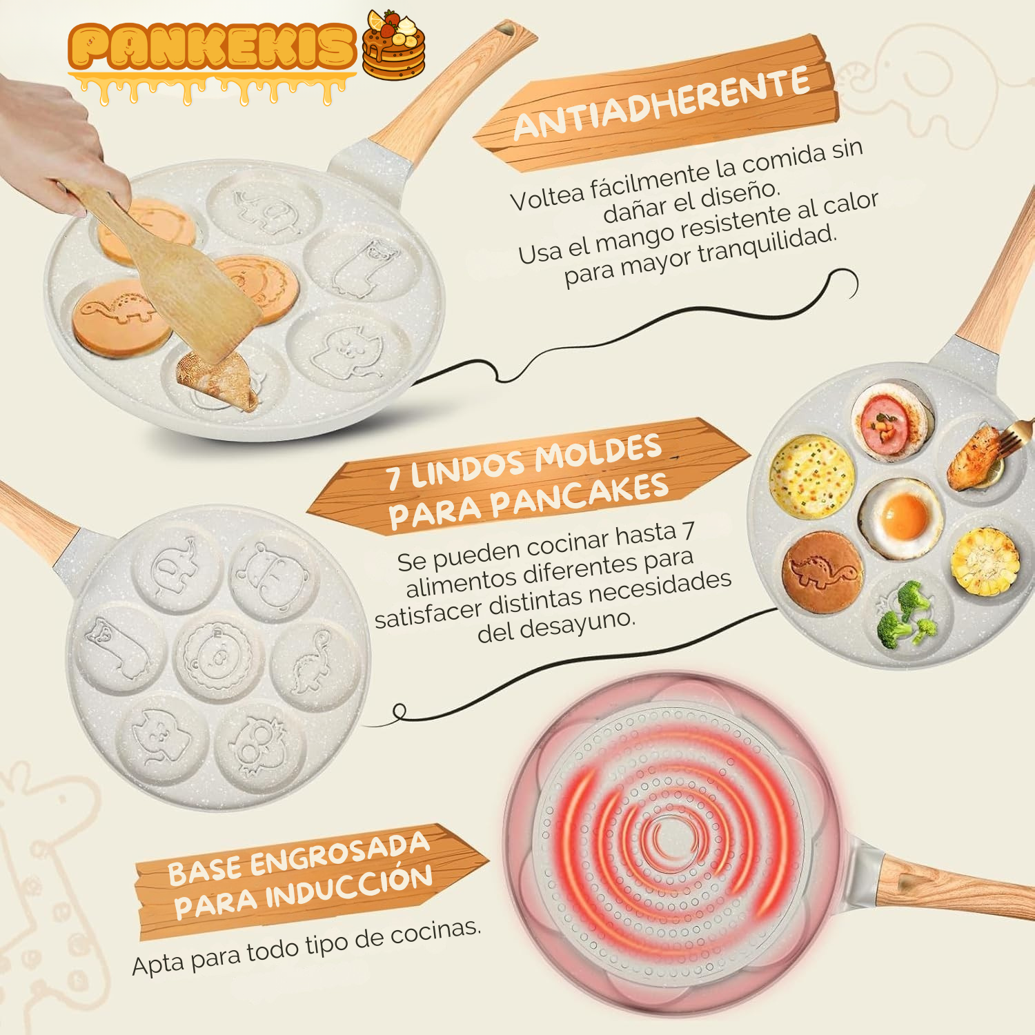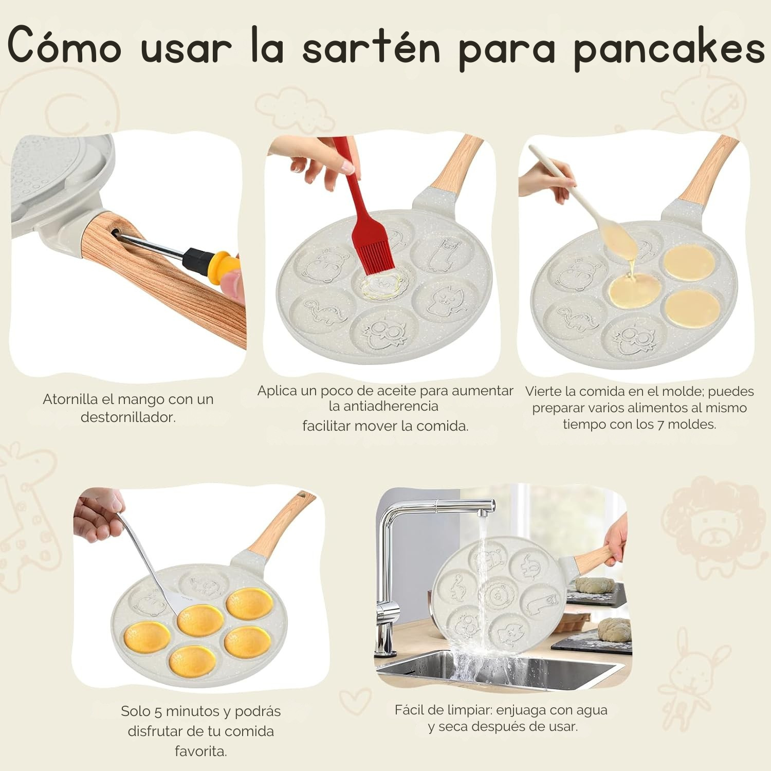 Convierte las mañanas en una aventura: nuestra sartén tiene 7 moldes de animales que hacen que los niños disfruten y aprendan mientras comen.